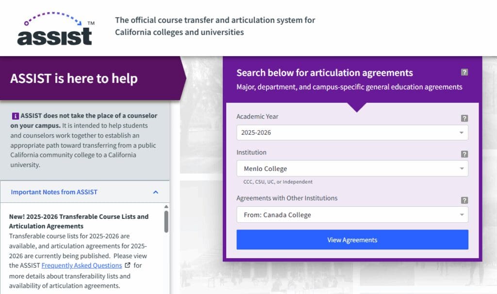 Official articulation agreements for Menlo College and participating California community colleges can be viewed on ASSIST.org.