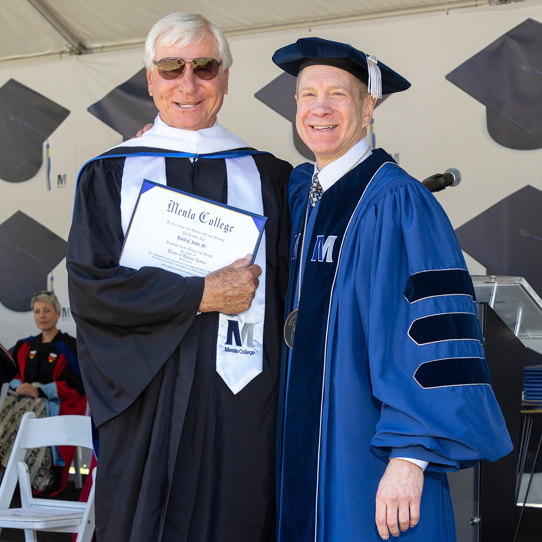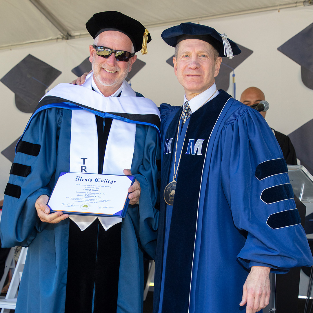 David Irmer Sr. and James Davlin V Earn Menlo College Doctorate of Humane Letters Posted on July 28, 2022January 27, 2025 by menlocollege During Menlo College’s Commencement on May 21, 2022, Board of Trustees members David Irmer Sr. ‘58 and James Davlin V were each awarded a Doctorate of Humane Letters for their service to the College. The degrees were presented by Micah Kāne ‘91, Chair of the Board of Trustees. The two were honored during a celebration of the Class of 2022, as more than 150 Oaks who persevered through the COVID-19 pandemic earned their bachelor’s degrees from Menlo College. “David Irmer and Jim Davlin earned this extraordinary honor through their commitment and dedication to Menlo College and its students over the years,” Menlo College President Steven Weiner said. “The College is incredibly grateful for all they’ve both provided as members of the Board of Trustees, and we look forward to their continued support in the years to come.” Menlo College Honors David Irmer’s Lifelong Dedication David Irmer is the president, founder, and owner of the Innisfree Companies, a real estate development firm he established in 1970 in the Bay Area. Over the past 25 years, Innisfree has succeeded in finding creative solutions for eight major urban revitalization projects in the Bay Area. Before Innisfree, Irmer established and managed the General American Development Corporation. Irmer spent one year at Menlo in 1958 before transferring to the University of Miami for his Bachelor’s Degree in Business Administration. “I came away from Menlo understanding that I could do just about anything I set my mind to,” Irmer said. “In just that one year at Menlo, we earned his lifelong dedication,” Kāne said. “He joined our Board of Trustees in 2010, and he has given exemplary service every day since then. He supports Menlo in so many ways, and it’s high time he is able to boast a Menlo College degree. Mr. Irmer has been involved as a member of the Urban Land Institute, the International Council of Shopping Centers and the California Redevelopment Association, and is actively involved in various Chambers of Commerce. Menlo College Recognizes James Davlin V’s Meaningful Commitments to Students James Davlin V led General Motors’ global treasury operations, including capital planning, capital market activities, worldwide banking, and pension funding. Davlin joined General Motors from Deere & Company, a global leader of agricultural and construction equipment, where he first served as Vice President and Treasurer, and then as Vice President of Corporate Strategy and Business Development. He also worked at The Procter & Gamble Company and at Eli Lilly and Company. “Jim has served as a Menlo College Trustee since 2014 and has served as Vice Chair of the Board, as well as chairing the Investment Committee since 2017,” Kāne said. “He regularly provides career advice to Menlo students, which has frequently included meaningful introductions for students interested in networking with well-placed individuals in the corporate finance world.” In addition to his service to Menlo College, Mr. Davlin is a trustee of Wabash College and a member of the Advisory Board for the Duke Center for Finance. Davlin earned his JD from Duke University School of Law, an MBA from the University of Chicago, and a BA from Wabash College. Read More: Menlo College’s Board of TrusteesMenlo College Celebrates Class of 2022 at Commencement2021-2022 Year in Review: Menlo College Students Place at Case Competitions and Present Research2021-22 Year in Review: Menlo College Students Celebrated with Scholarships and Recognition